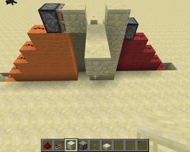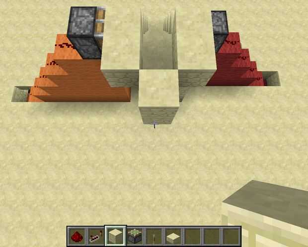 Desde el centro superior, Coloque 2 bloques de piedra arenisca volviendo. Una cuadra arriba, coloque 3 piedra arenisca en forma de 'C' para que no lava puede escapar. En la parte inferior de la escalera, hacer lo mismo. Mueva la palanca para que el sistema está encendido y lava en el agujero en la parte superior de la escalera. Para que la lava fluyendo hacia abajo de la escalera, el sistema debe desactivarse para que los pistones se retraerán.