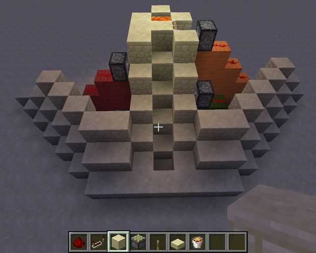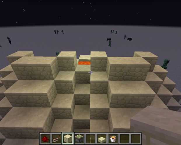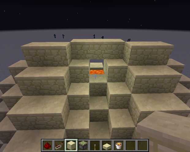 Para finalizar, hacer una fila diagonal de piedra arenisca a la derecha y hacia la izquierda. Luego hacer otra fila pero a una cuadra de nuevo. Continuar hasta llegar a la parte superior. Puede completar el proyecto sin embargo le gustaría. Decidí agregar una fila superior de la piedra arenisca. Si la lava no es tuyo, puede cambiar la lava para el agua y, si todavía quiere luz, interruptor de la fila inferior de escalera de piedra arenisca de piedra brillante.