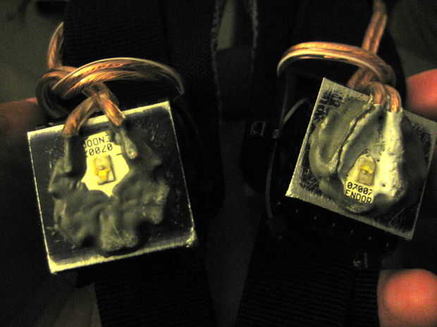El faro de la derecha fue el primera y ver, iteración. He probado con resina y que funcionaba tan bien. La izquierda es cómo lo haría si tuviera que hacer otro juego de estos. Que están casi totalmente expuestos, pero parecen estar bien con eso. La parte rebelde LED real tiene este claro goma burbuja cosita, que es muy frágil y pronto fue rasgado apagado de cada uno. Pero notablemente no cambia la óptica. JB Weld tiene y cierra los contactos. Para cada luz, apreté los lados puntiagudos de dos disipadores de calor en sí, que luego me dio estas ranuras que yo pude ataduras de cremallera para unir a las correas de mochila con.