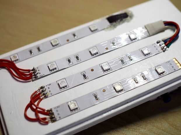 Despegue las tiras y péguelas en la parte inferior de la tapa de su tanque/contenedor. Utilizar cables de conexión para soldar las conexiones entre sí. En la foto, algunas de mis tiras led fueron fraudulentamente por lo que se puede ver va de rojo a verde, etc. Otra vez, tendrás que verificar tus propias tiras.
