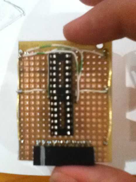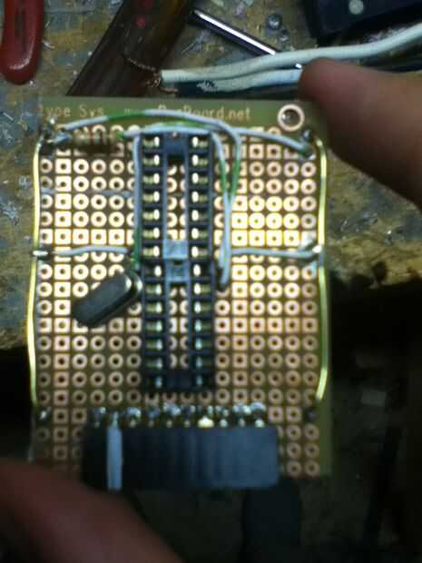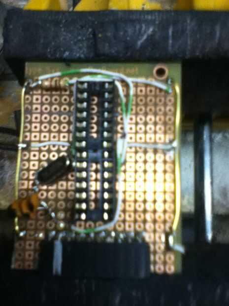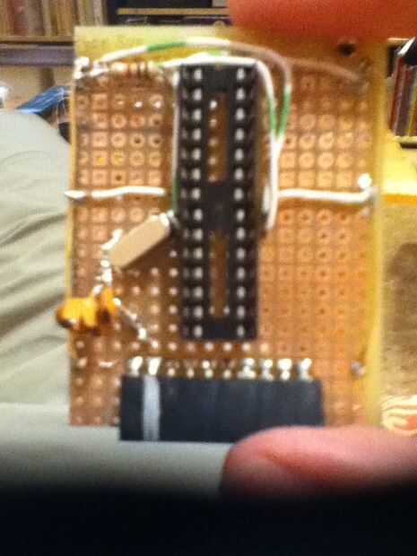 Debido a mi tienda de electrónica local no tener una toma de chips lo suficientemente grande para el Arduino en el momento de la compilación que decidí usar una rúbrica femenina. No. Resulta que esto crea una conexión muy descuidada entre el cristal y el Arduino. Esto significó que sincronización de Arduino fue apagado y no pudiera comunicarse constantemente con la tellymate. Estaba en el extremo capaz de solucionar este problema utilizando dos 14 pines zócalos en vez de uno de 28 pines. En las fotos verá que hay dos grupos de condensadores de cerámica, esto es porque no tenía las tapas de 22pf necesario disponibles y en su lugar utilizar en paralelo dos capacitor de 10pf y 1pf dos condensadores. No lo hace cualquiera. Resulta que 10pf condensadores o capacitor de 20pf funcionar bien, sin embargo si tienes condensadores de 22pf, utilizarlos.