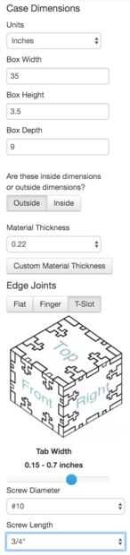 Para simplificar esta construcción sin sacrificar el producto final tomé la decisión al laser corte el caso. -Tomé la decisión de usar #10 3/4 de pulgada tornillos para asegurar el caso - una vez que hice que me fui a MakerCase e introducir los siguientes valores:
