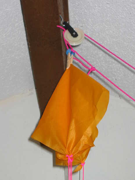 No ponemos una polea en el extremo inferior del bucle. Acabamos de poner un lazo de cuerda a través de él y que atadas a un archivador en th otra habitación. Que mantiene el lazo colgando hacia abajo en medio del salón y de la manera.