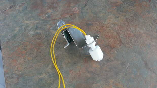 Necesita un soporte personalizado para mantener la línea de agua (manguera) y el interruptor de nivel. Puede utilizar una placa de aluminio fina y luego fijarla al depósito.