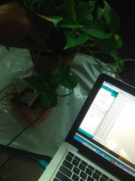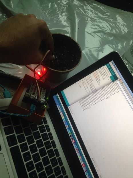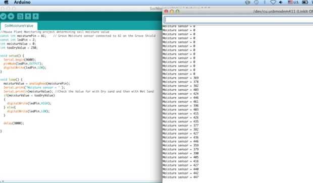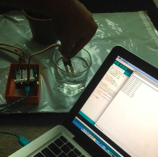 Descargar el código adjunto y sube a LinkIt uno y luego el serial monitor abierto, usted inmersión sensor en un vaso de agua como se muestra en la imagen y hacer una nota de la lectura, además también insertar el sensor de suelo en una olla seca triste si tienes una mano.