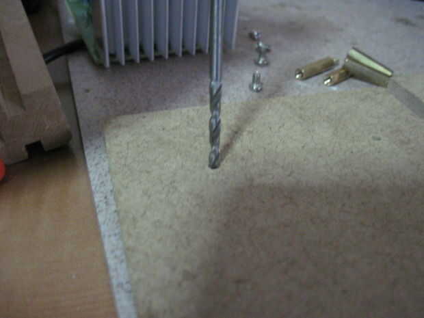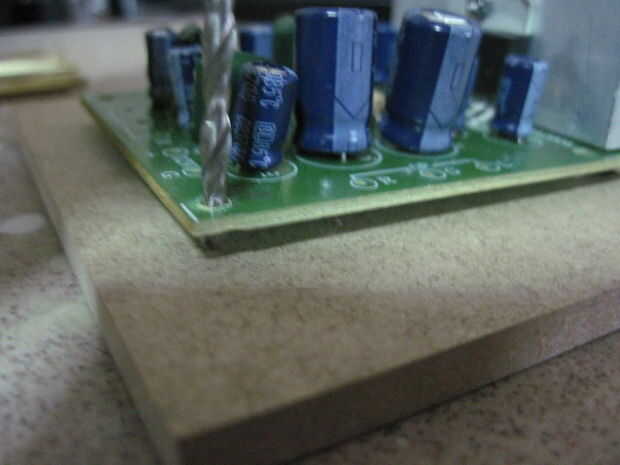 Estoy usando un tornillo pin aquí puesto que no necesito mucha velocidad o fuerza. Usando la placa de circuito como una plantilla significa que puedo obtener todos los agujeros perfectos. Coloque la placa en el tablero del MDF y empuje hacia abajo el tornillo pin para marcar la ubicación de cada agujero. Luego perfore un agujero hacia abajo en cada ubicación. Naturalmente usted realmente no debería hacer esto con un PCB totalmente poblado, pero que podrían si usted necesita.