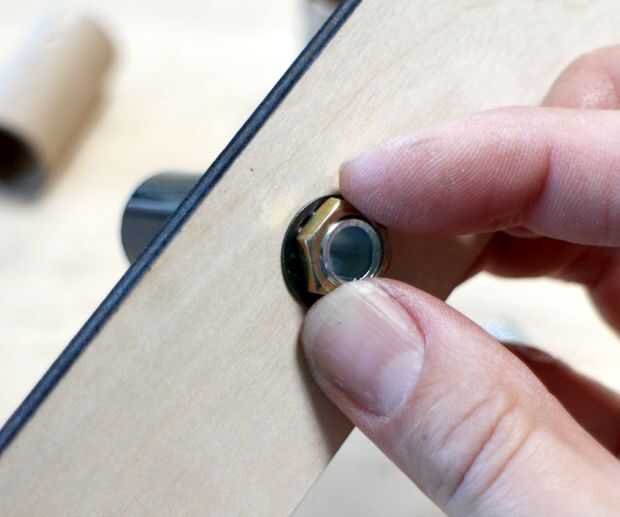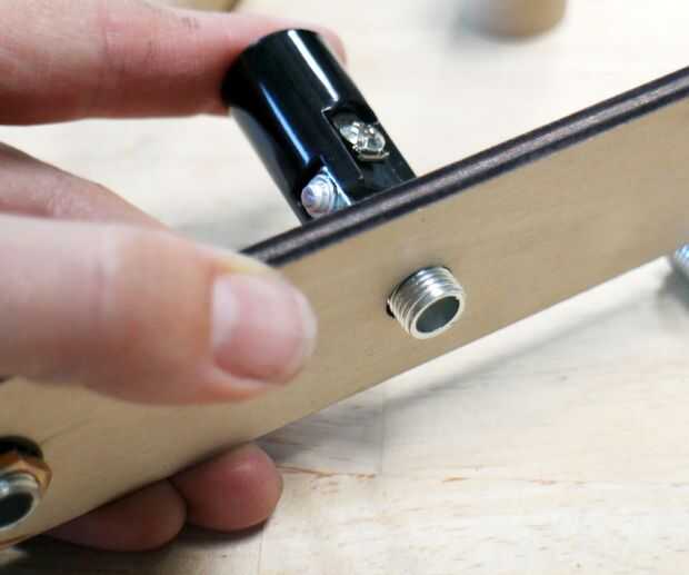 Deslice una arandela niple roscado y luego al final a través de uno de los agujeros en el láser cortar pieza de madera. Añadir otra arandela y asegurela en su lugar con una tuerca hexagonal, con sus cerraduras de llave o canal ajustables.