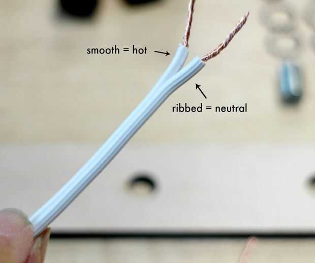 El lado liso de la cuerda es el lado 'caliente' y que corresponde con el post de tornillo de latón en el zócalo. La parte acanalada de la cuerda es el lado 'neutral' y va al poste de tornillo níquel (plata) en el zócalo.