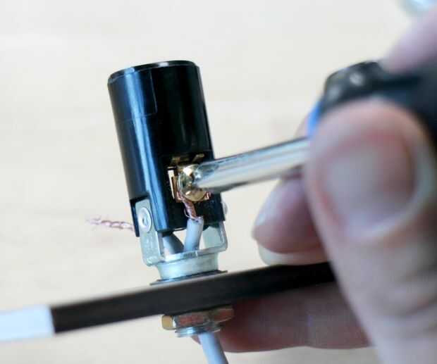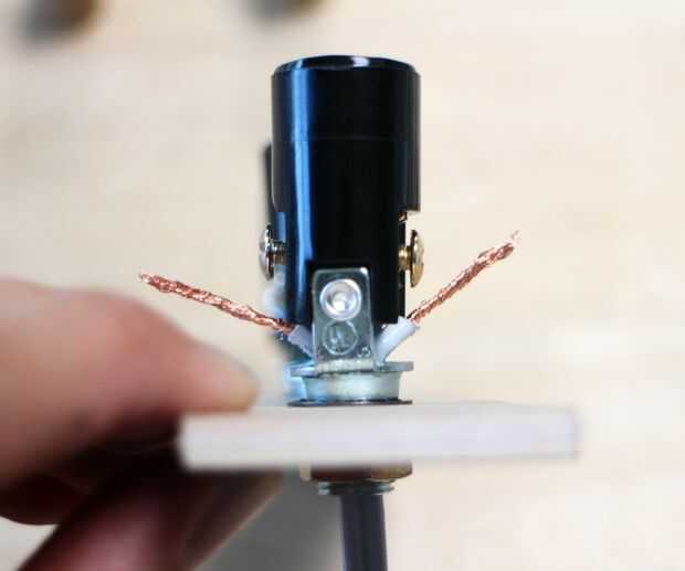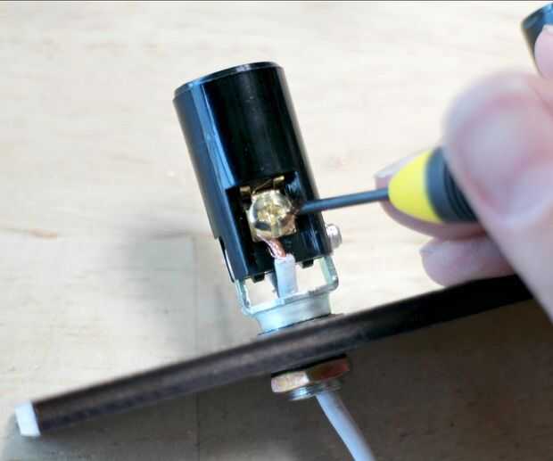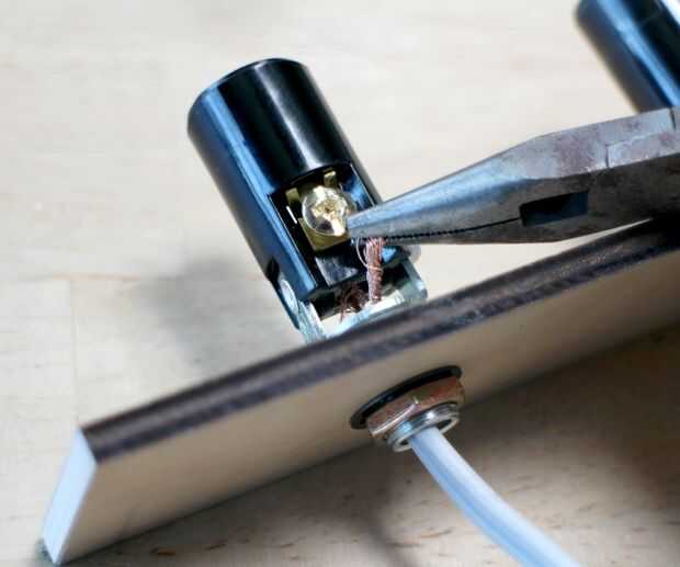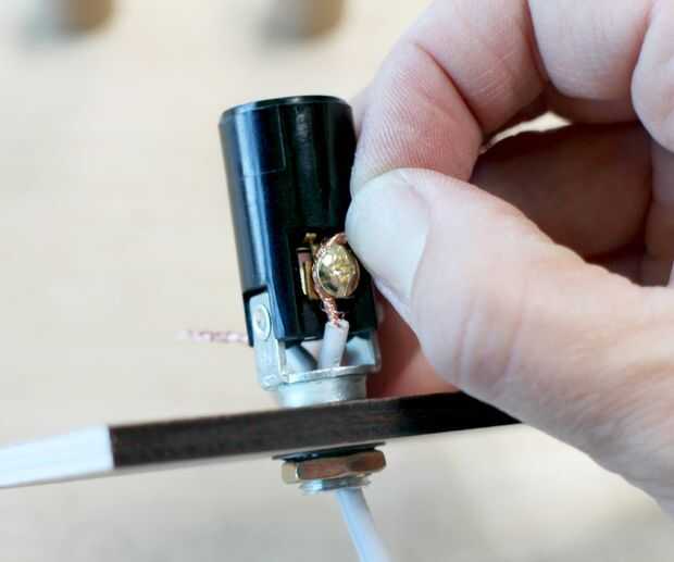 Desenroscar el tornillo de latón completamente y envolver el alambre 'caliente' torcido alrededor del tornillo hacia la derecha. Utilice el controlador de tornillo de cabeza plana pequeño tuck y ordenado para arriba. El tornillo en firmemente, asegurándose de mantener tanto el alambre bajo la cabeza del tornillo como sea posible.