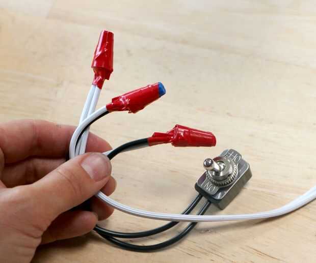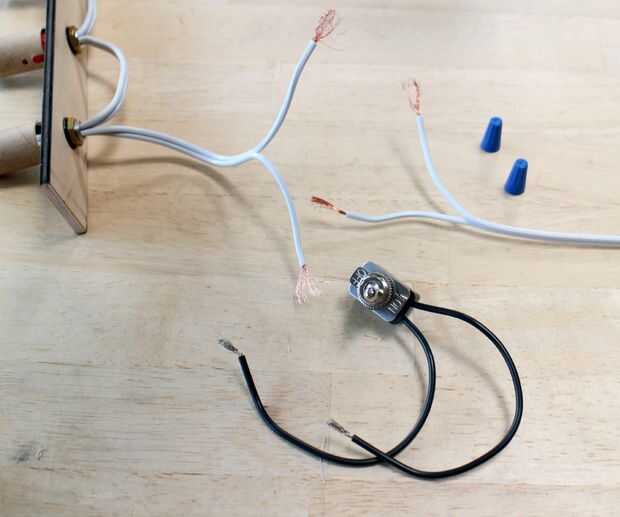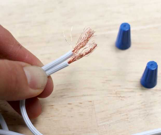Para agregar el interruptor para las luces, cortar el cable de 6-8" de la base de la última toma. Sueltamente el trence los cables de neutro/proveyó de costillas y añadir una tuerca para alambre, torcer en hasta es difícil torcer ya.