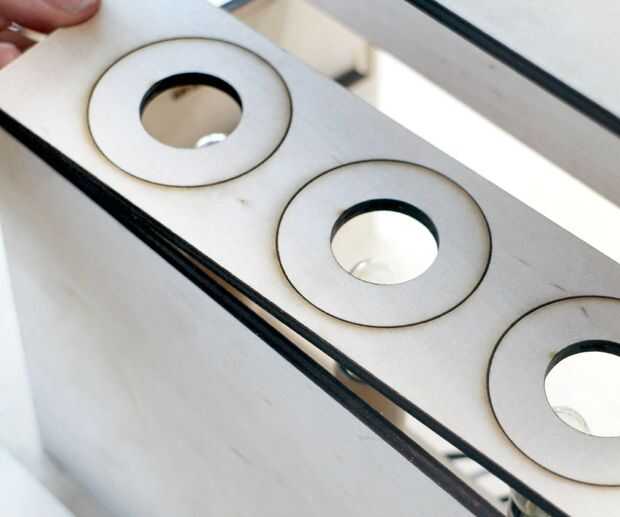 Desde la parte delantera, inferior en la pieza de soporte de madera con los agujeros más grandes, rastered agujero líneas hacia arriba. Se encuentra dentro de los soportes superior.
