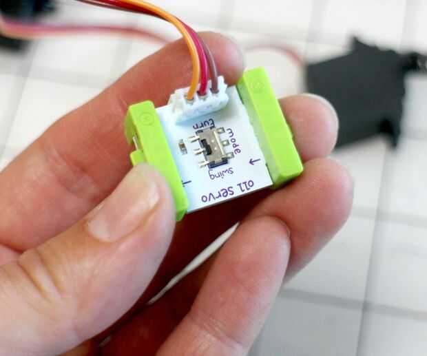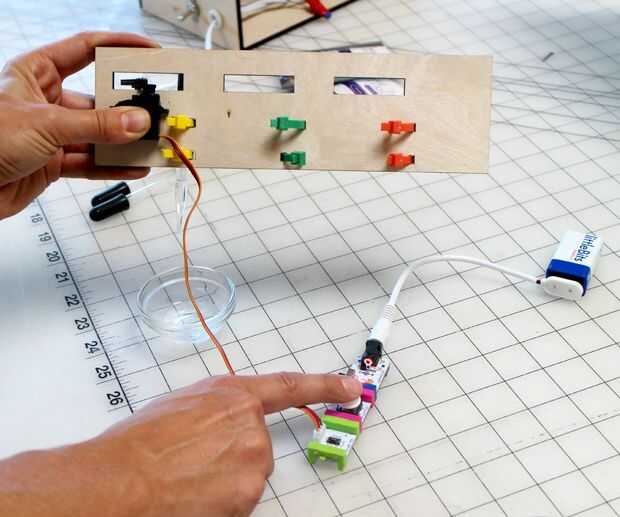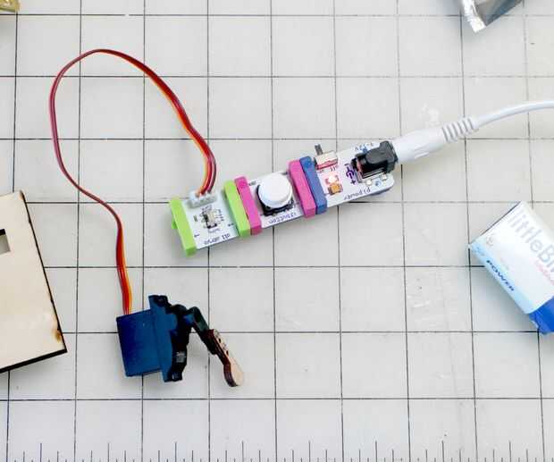 De una manera fácil de probar los movimientos, conecte el littleBits módulo de alimentación de 9 voltios al módulo de botón.