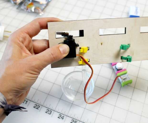Sostiene la pieza de madera con los lazos del cierre relámpago, así que el las espaldas de los lazos del cierre relámpago son mirando hacia usted y corte outs en la parte superior. Colocar uno de los goteros en los lazos del cierre relámpago delantero izquierdo. Llenarlo con agua. Luego poner el servo plano contra la madera con el brazo atravesando la abertura izquierda y los cables en el lado derecho. (como en la foto superior)