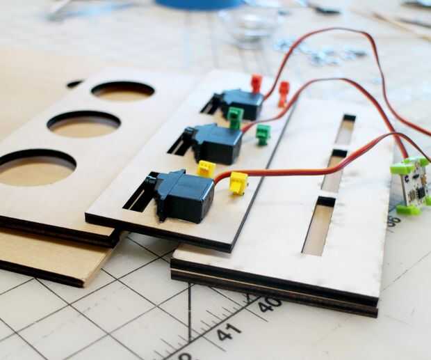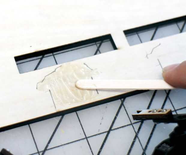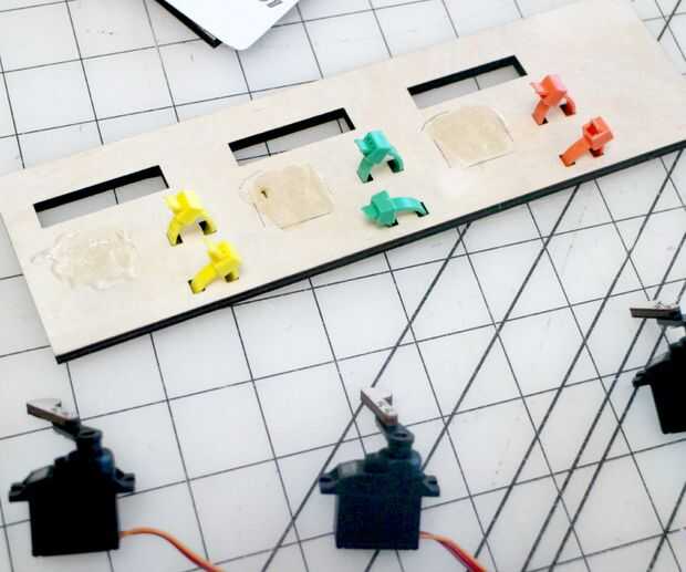 Consejo: encontré que poniendo los trozos de madera en pilas de otra madera dejando un canal para el servo brazos para descender en facilitó el proceso de pegado mucho.