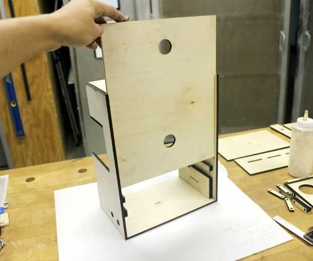 Voltear la caja vertical hacia atrás y coloque el panel posterior. El se acaba, pero no totalmente, por lo que poner en el panel posterior ayudará a cuadrada de la caja.