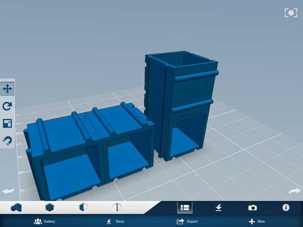 Puede duplicar los contenedores y utilizar la herramienta de complemento para ponerlos juntos. Sugiero ajustar las caras planas. Deberás hacer algunas fantasia giratorio para conseguir que funcione. Es mucho más fácil hacerlo en la vida real! He incluido el archivo .stl en caso de que algunos de ustedes son demasiado perezosos para crear usted mismo. También puede imprimir 3D el modelo que hiciste o las que he incluido. Naturalmente, debe imprimir por lo menos dos para poder para realmente utilizar los accesorios.