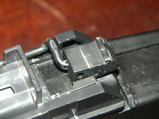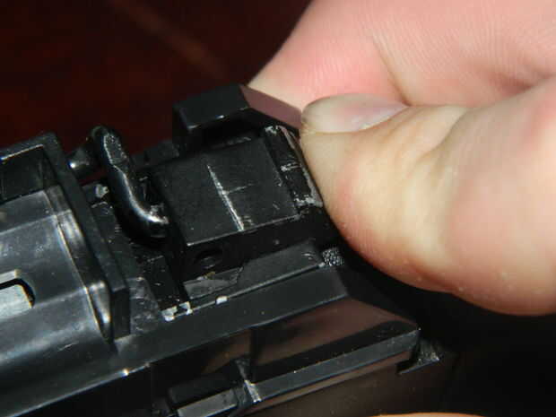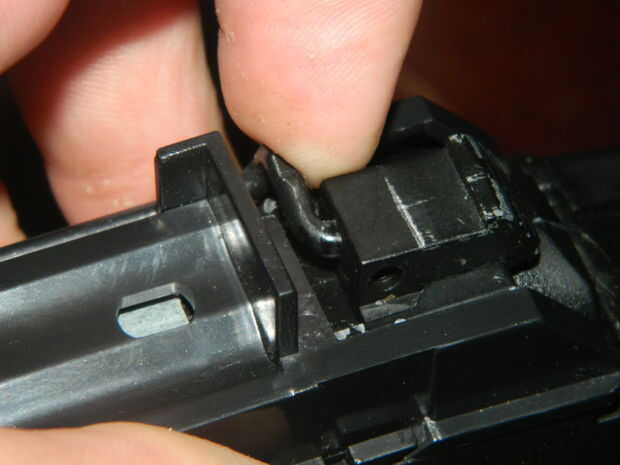 ahora con el tornillo quitado mirada atrás hacia la culata de la pistola donde el botón fue que usted presiona para quitar el protector superior en este paso nos va quitar ese botón También he incluido un vídeo para su connivencehttp://www.youtube.com/watch?v=vDgPkpjS-ve&feature=youtu.be
