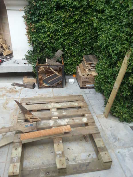 Madera de palets - fácil venir por - mi método preferido es quitar un hueco entre las mejores tablas y el resto de la plataforma con un cincel o palanca barra y luego cortar las tablas con una sierra de sable (sierra alternativa).  Esto deja las cabezas de los clavos en la que se ve buena - o puede retirar los clavos una vez que los consejos son gratis y volver a utilizan los agujeros.