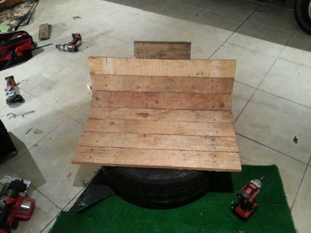 Mismo principio excepto aquí toda la madera utilizada era otra vez de la misma plataforma. He arreglado la ply ruedas en un lado del neumático y las tablas de la plataforma directamente a la goma en el otro lado.