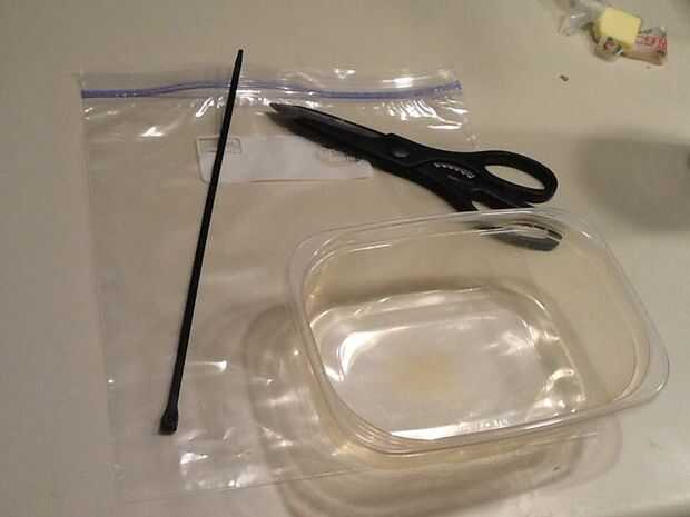 Necesita una amarra, una gran bolsa de ziplock o abarrotes, tijeras y un cubo.