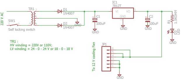 Hay dos esquemas que se muestra. Si está utilizando el transformador de voltaje secundario 18V o más utilice el esquema que LM7812T. No utiliza transformador de tensión secundaria superior de 40V. Puede dañar el regulador de voltaje.