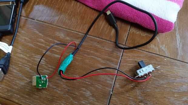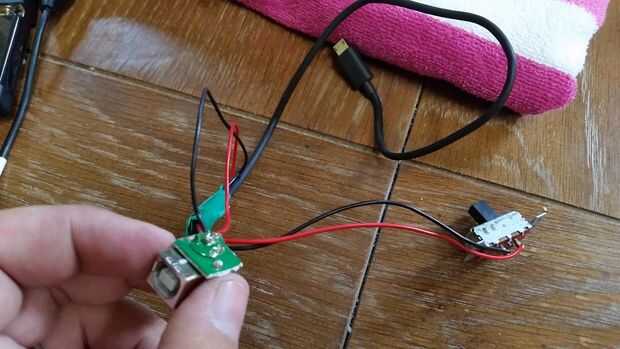corté el usb puerto tipo B de un antiguo recinto de disco duro externo para la toma de corriente. Corte el extremo de un cable micro usb. conectar el cable de tierra negro con el conector de tierra en el enchufe usb. el cable de 5v rojo recorre el interruptor original de snes. de esta manera el original botón para prender la unidad.