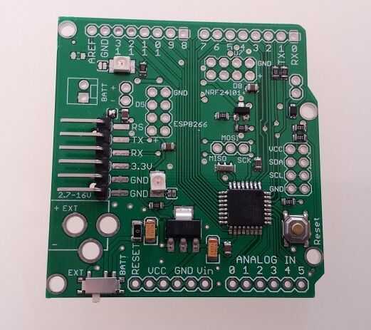 Placa Arduino personalizado es adecuado para biblioteca EasyIoT ESP8266 Arduino. Lo único que falto es el pin de reset conectado a un pin del Arduino hacer. Esto se puede solucionar con un cable corto entre digital pin 2 y pin de reset en ESP8266. El tablero tiene por puentes de soldadura por defecto para la conexión serial entre los puertos ESP8266 y HW de Arduino. En mi caso que quiero depurar programa así que mantener soldar puentes inconexos y agregados dos hilos hacer pernos (10 y 11) para el software de serie. Tensión para el tablero es entre 5 y 12V.