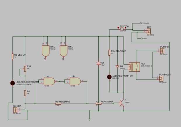 Lo hace este circuito es medir la resistencia natural que tiene la tierra para oponerse a la corriente eléctrica corre por los cables de prueba. Al estar la tierra mojada disminuye la resistencia a la corriente pasa por la tierra y esto hace el circuito se cierre y la bomba de agua se apague. El circuito es tan eficiente electronicamente se puede utilizar con baterías pecado ningún problemas.