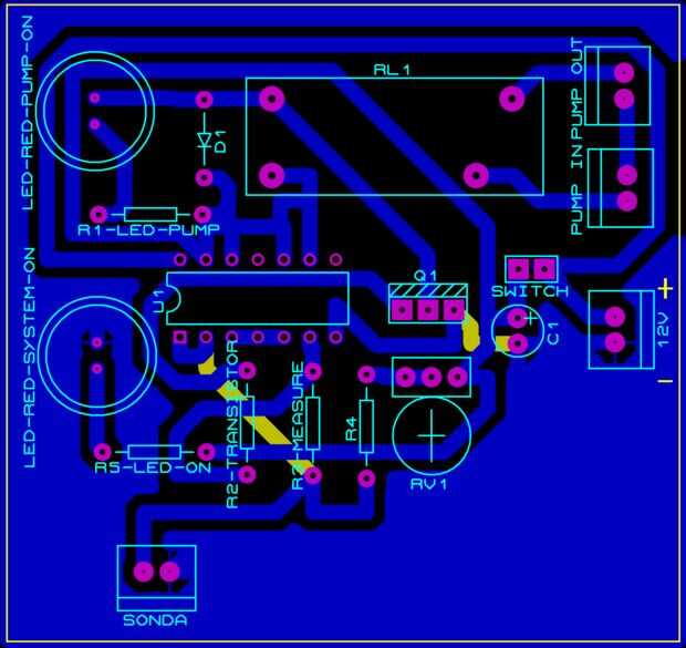 Éste circuito es mas pequeño en realidad. Se muestra una una mayor escala para apreciar los detalles. las lineas amarillas aparecen en la imagen se deben de cables de con de conectar, esto se debe a que no hubo espacio para esas conexiones en la placa de cobre.