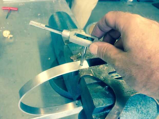 3) corte agujeros - una vez que tenga la pieza donde cabe en la cabeza, orificios con éter el taladro de mano o una prensa de banco. Realmente hace esta banda dos veces, la segunda versión que utilicé para la pieza final como corte los orificios mientras que el bar era plano, que es mucho más fácil que hacer que cuando la barra se curva.