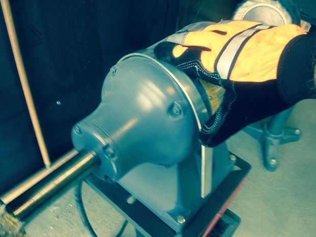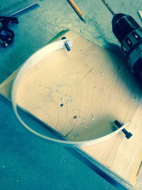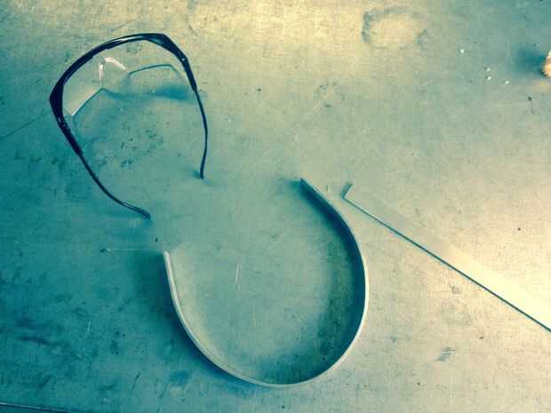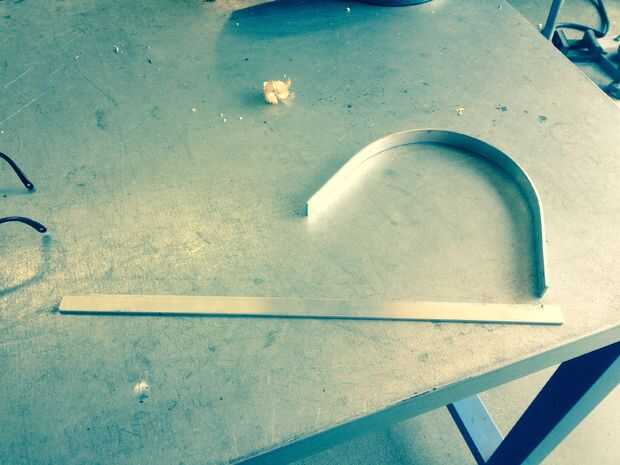 2) de la barra de la curva - solía la amoladora de banco tienda doble con cuidado la pieza de aluminio en una forma de "C" apretada, muy cuidadosa desde el centro de la curva. Usted realmente necesita algo grande, redonda y sólida para ello. Usé mis guantes de trabajo para este paso para proteger las manos al estar inclinado. Desea que esto casi es capaz de mantenerse en la cabeza por sí mismo pero no del todo.