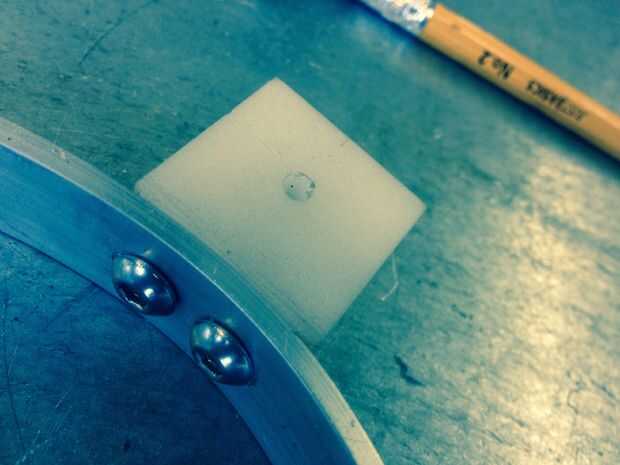 Esto fue bastante complicado para hacer - probablemente puede utilizar un pedazo de madera o de otro plástico, tengo acceso a algunos tan sorprendentes materiales en Instructables fue capaz de encontrar un pedazo de Delrin que funcionó a la perfección. Usted puede probablemente recoger tales desechos en su fuente de plásticos locales. De todos modos, me perforado y golpeado ligeramente de la mayoría de los agujeros de tornillo en esto antes de cortar a su tamaño.