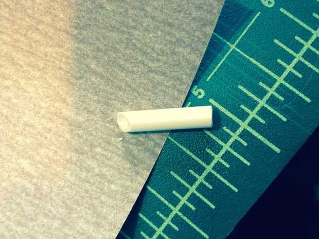 1) utiliza un pequeño tubo de plástico de estireno de 5/8" de largo, corte de un lado a 90 grados del otro en un ángulo de 45 grados. Esta funda se ajusta perfectamente sobre la varilla de fibra de carbono.