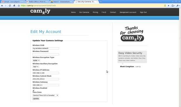 http://cam.ly/login que esto le llevará a la página de tu cuenta.  En su página de cuenta, haga clic en configuración inalámbrica e introduzca su información inalámbrica.  Esperar un tiempo, entonces usted debería ser capaz de desconectar el cable de Ethernet.