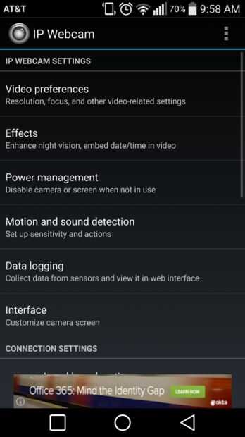 En el juego tienda allí es una aplicación llamada IP Webcam. Hay una versión gratuita y una versión de pago. Sólo se necesita la versión gratuita. Una vez instalado, desplácese hacia abajo y haga clic en "Difusión Local". La familia de dirección principal puede permanecer como está, pero si su uso de varias cámaras cambia cada teléfono a su cada puerto individual (es decir, 8080, 8081,8082, etc..) Te recomiendo también cambiando la contraseña de inicio de sesión. Después de esto, vaya a la primera página y éxito "iniciar servidor" después de esto verá una alimentación de la cámara y una dirección IP en la parte inferior. Tome nota de esto. La mayoría son muy similar.