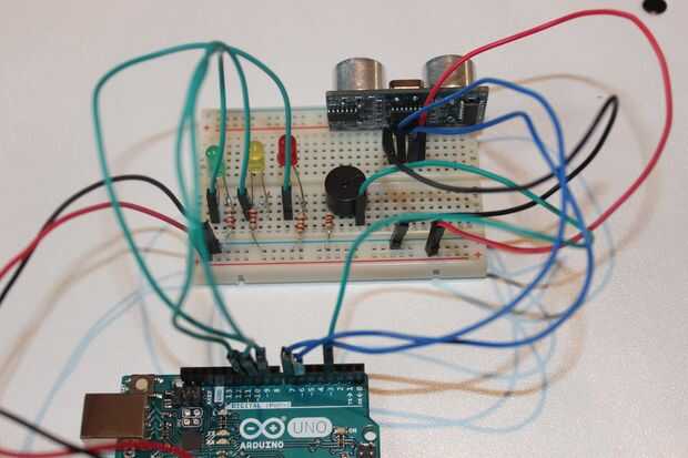 La última parte de la instalación de este, se conecta el zumbador y la placa Arduino. Esta es una de las partes más fáciles de la instalación entera. Todo lo que debe hacer es conectar la pata más larga del zumbador a la clavija 3 de Arduino usando un cable verde y luego conecte la pata más corta del zumbador al canal negativo de la placa con una resistencia de 220 ohm.