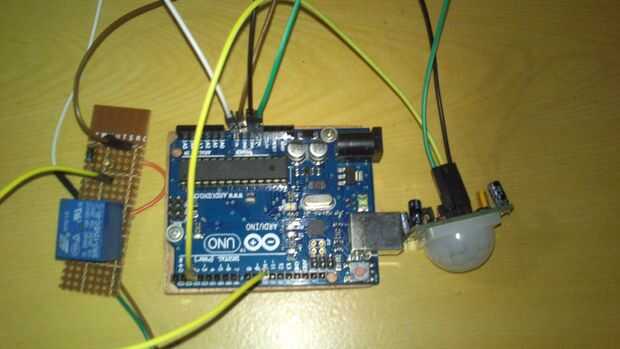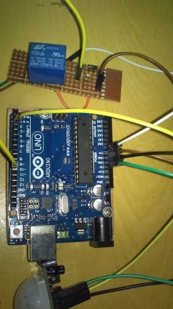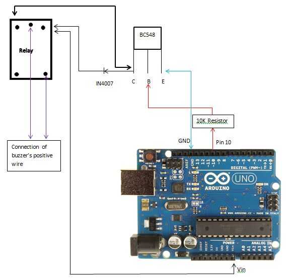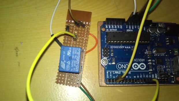 Conecte los cables del circuito de relé para el Arduino como se muestra en la imagen dejando los cables del zumbador sólo. Después de eso debe ser algo como esto. En mi caso los cables del zumbador son el verde y marrón uno.