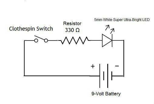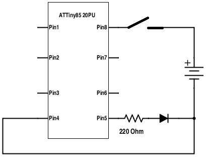 La lista de piezas es muy simple. Una batería de 9 voltios, una resistencia de 330 ohm, un ultra brillante LED y un interruptor de pinza para la ropa por encargo. Actualización 07/06/2015. Si eres un aficionado de Arduino, se puede hacer un nifty intermitente con un chip ATTiny85-20PU (costo para el chip es de $1,50 en eBay). Se puede programar para hacer cualquier tipo de parpadeo como--editar sólo el bosquejo de parpadeo muestra. Hice uno con código Morse que dice: Mail es aquí ". He conectado el esquema para que uno por encima.