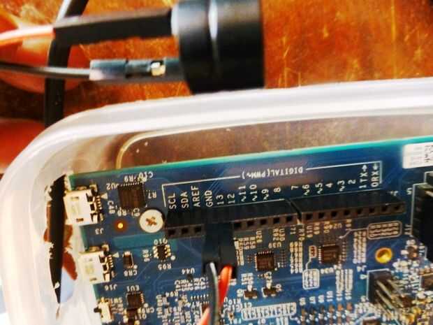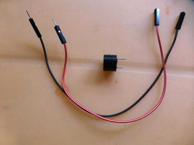 - Conectar el timbre - Seleccione dos cables de puente de hombres y mujeres de diferentes colores, digamos rojo y negro. Inserte el extremo hembra del cable rojo al pin largo del zumbador y el extremo macho en número de 13 pines en el escudo de la Base. Hay un LED incorporado que se conecta al Pin 13. Probablemente el primer programa de Arduino que ha subido es "Blink LED". vamos a utilizar el mismo pin para el zumbador. Conecte el extremo hembra del cable puente negro a la patilla corta de zumbador y el otro hombre a la tierra, marcada como "Tierra" que está junto al pin 13.