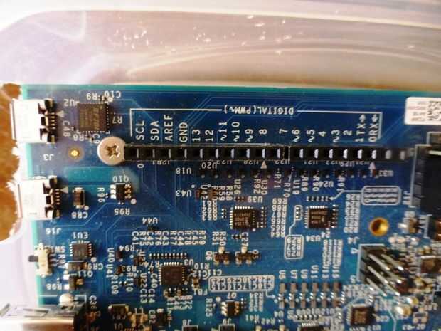 - Conectar el blindaje de la Base de Grove - The Grove Base escudo V2 es compatible con la mayoría de las placas Arduino disponibles. Algunas placas funcionan con fuente de alimentación de 5 voltios y algunos con 3.3 voltios. Intel Edison Breakout Junta se basa en la placa de Arduino Uno que trabaja en la fuente de alimentación de 5 voltios. Puede encontrar el interruptor selector en el escudo de la Base cerca de la A0 de conector analógico. Coloque el selector de alimentación a 5 voltios. El número de pines en Grove Base escudo es el mismo que de tablero de Arduino Uno, así se podrá insertar directamente en el tablero de arranque de Edison.