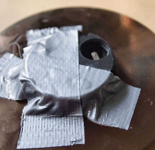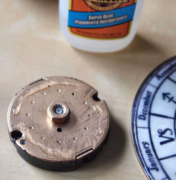 he pintado la parte superior del mecanismo del reloj con pintura de oro. Luego lo pegué en la parte posterior de la bandeja de disco duro. Yo también había grabado en la espalda con cinta adhesiva.  Se ha añadido una pequeña tuerca en el mecanismo del reloj alrededor de las manos para proporcionar estabilidad cuando se coloca el pincho en.  La placa y reloj encajan perfectamente los engranajes en la base.  No pegarlo en puesto que necesito acceso a la batería.