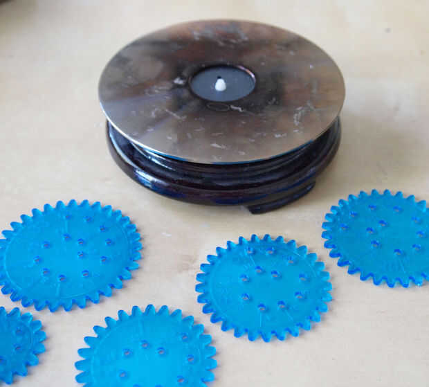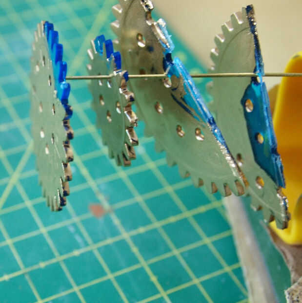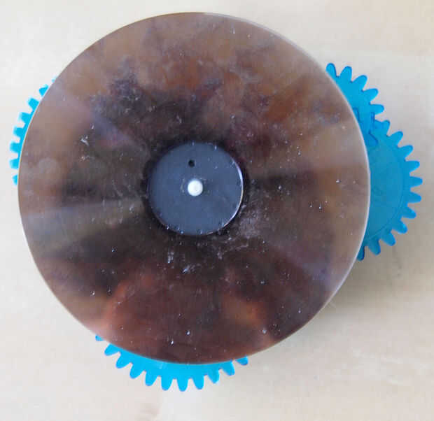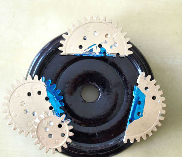 tenía un soporte de la mentira alrededor de la casa que era perfecta para mi imitación orrery.  Cuando coloqué el reloj en el soporte y poner el plato del disco duro en hubo un poco de una brecha.  El hueco parecía el lugar perfecto para añadir algunos engranajes.  Lamentablemente, no tengo ninguna engranajes grandes ahí y no sabía cómo hacerlas.  Vagaba por los pasillos de una tienda de dólar y me encontré un juguete barato de espirógrafo que por supuesto tenía poco engranajes plásticos.  Pintado oro, que también tuve que recortar algunos para que el reloj se ajusta y luego pegado a la base con pegamento PVA.