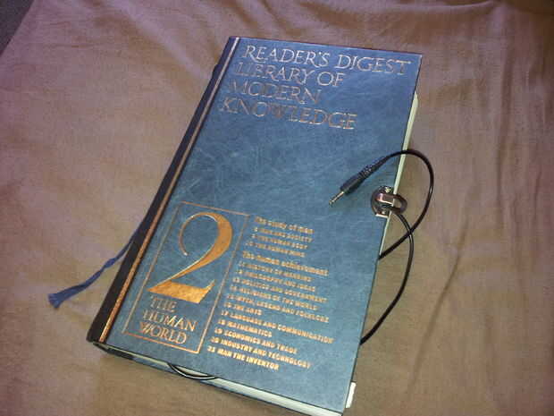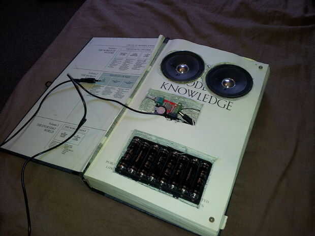 un libro grueso (5cm) fue cortado para arriba. Utilizando un amplificador clase D con salida de 10W en cada canal (comprado en ebay por 7 dólares), 8 baterías AA (que proporciona 12 v) y dos pequeños altavoces que arrebató de una vieja radio. La parte más difícil es cortar los agujeros en el grueso libro, usé un taladro para hacer la mayor parte de la destrucción de la página... Dos tornillos sujetan las páginas. Un cable de aux está conectado a la amp y su listos para volar mentes de tus amigos en la escuela!!!!
