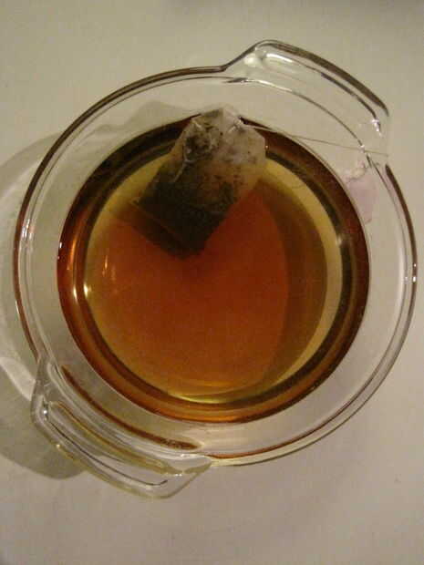2. Coloque dos bolsitas de té de desayuno en la taza de agua. Deje las bolsas de té en el baño por un par de minutos.