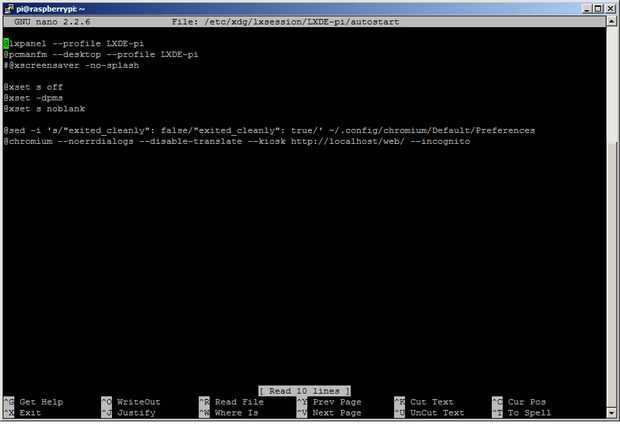Por último tenemos a cromo para el inicio y la página a cargar una vez botas sin cuadros de diálogo de error y en modo quiosco. Para hacer esto añadir la siguiente línea al final de este archivo autostart.