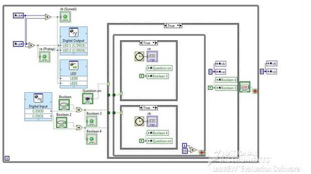 Condicional los lazos de la A y B valores booleanos (entradas del jugador) se ejecutan en ciclo de una ejecución (es decir, alrededor de un segundo micro) del Micro procesador MyRIO-1900, por lo tanto, para asegurarse de que el usuario obtiene suficiente tiempo para que la prensa se utilizó un tiempo de bucle y terminó en la décima iteración.