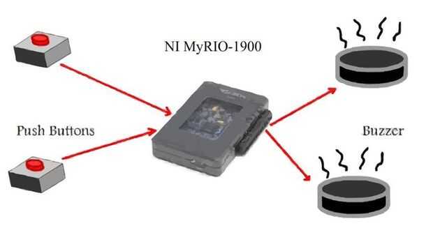 Aparato: NI LabVIEW, pulsadores, acordes de puente, los cables, NI MyRIO-1900, zumbador.