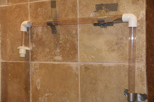 Los conectores de tubo de PVC debe caben todos firme y uniformemente alrededor de los tubos de acrílico transparente, por lo que no debería tener ningún problema en conectarlos juntos para construir el marco simple. Conecte las Cámaras de contención en cada extremo del marco de su sistema y entonces usando cinta adhesiva, cinta alrededor del borde de la Tienda Vac boquilla manguera que puede caber en la parte inferior de la cámara. Por último, puede utilizar cinta adhesiva para asegurar el marco a la pared.
