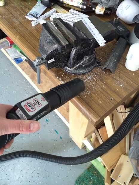 Ahora es el momento de la prueba. Quité una de las tapas de uno de los extremos y conectar la manguera con el acoplamiento flexible. Una cosa agradable es que mi aspiradora para mojado/seco tiene un interruptor remoto. Hubo un poco de succión perdido, pero no tanto. Sigue lo que necesito.