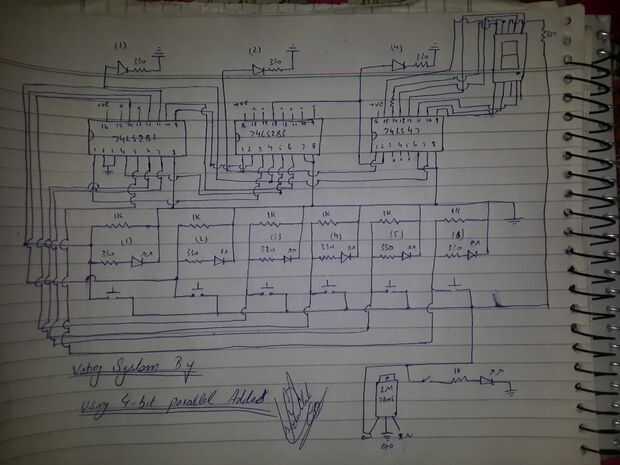 Con la ayuda de este diagrama podemos construir nuestro propio proyecto de sistema de votación muy fácilmente. Sólo tienes que seguir muy cuidadosamente el diagrama. Te diré algo en el pin 14 del 74ls47 que una resistencia de 330 ohm se une con 7 segmentos led's que no es mención en un diagrama por error.
